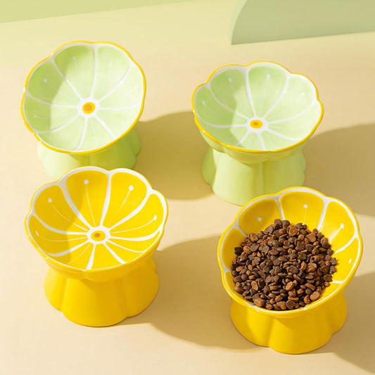 PETSARY Lemon Shape Ceramic Raised Cat Food Bowl with 1 Pcs Tag Gift